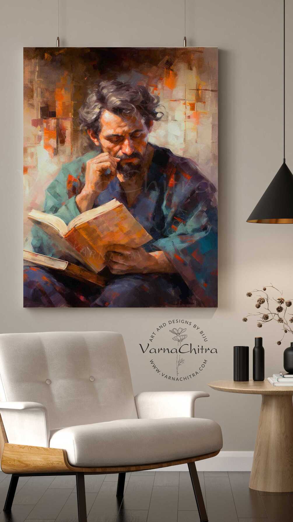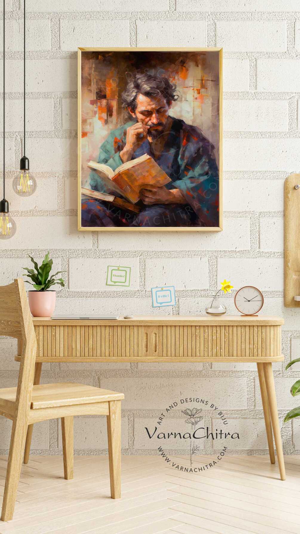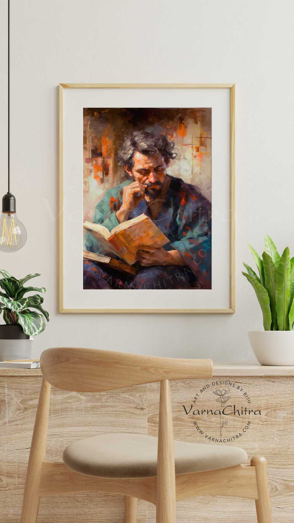 "The Enigmatic Scholar" shows a noble man deeply absorbed in reading a book. He has a well-groomed mustache that he absentmindedly twirls, giving him an air of mystery and intellectual curiosity. The painting's detailed brushwork brings out the textures of his cloak and the open book on his lap. As he focuses on the pages, you can almost sense the energy of his inquisitive mind. "The Enigmatic Scholar" invites viewers to think about the power of knowledge and the appeal of written words, embodied by this mysterious figure lost in his world of literature.