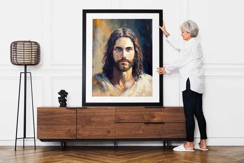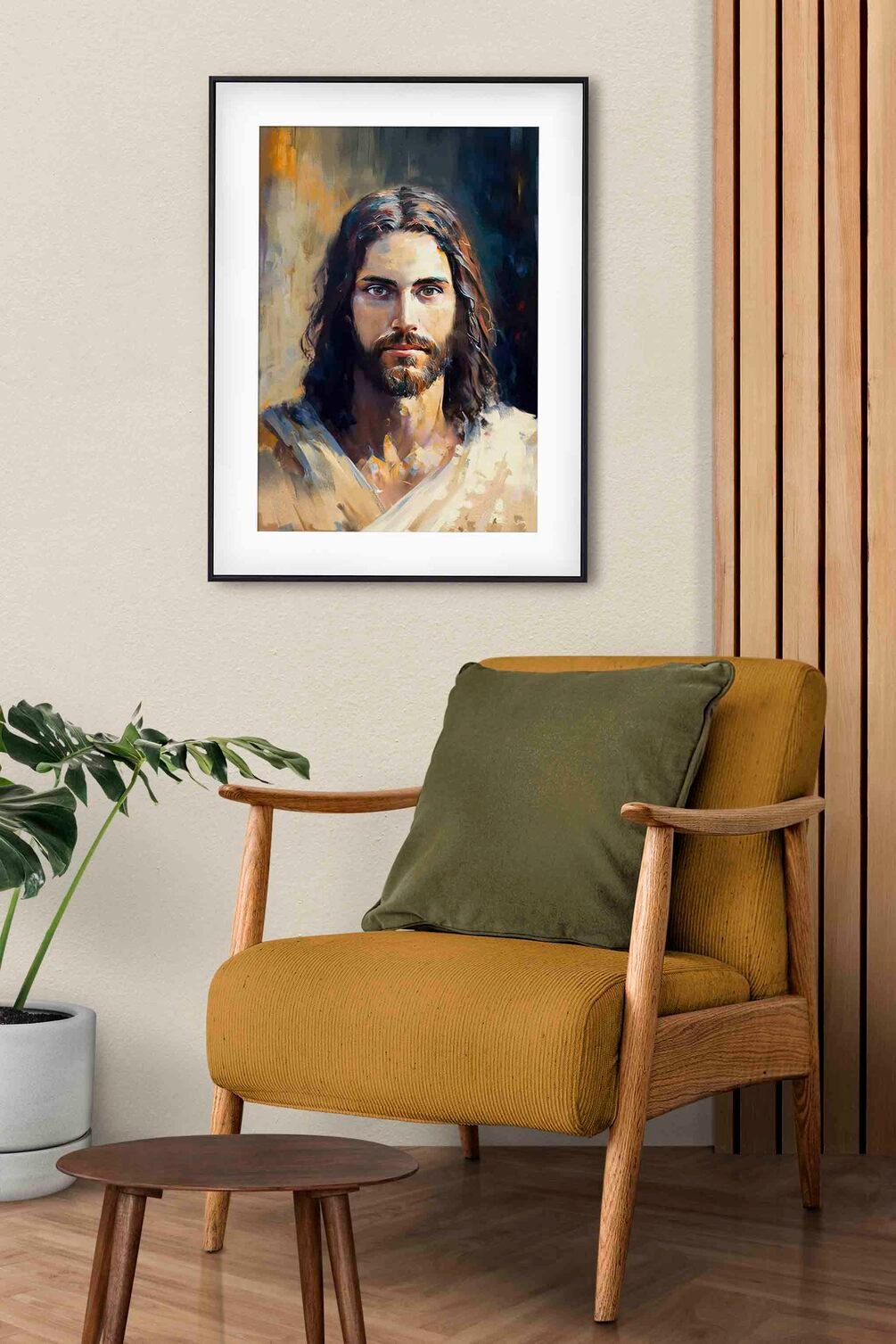 Unique High Resolution Digital Painting of Jesus Christ 2 in Yellow and Blue base colors in Impasto Oil Pinting Style. Extra Large Size.